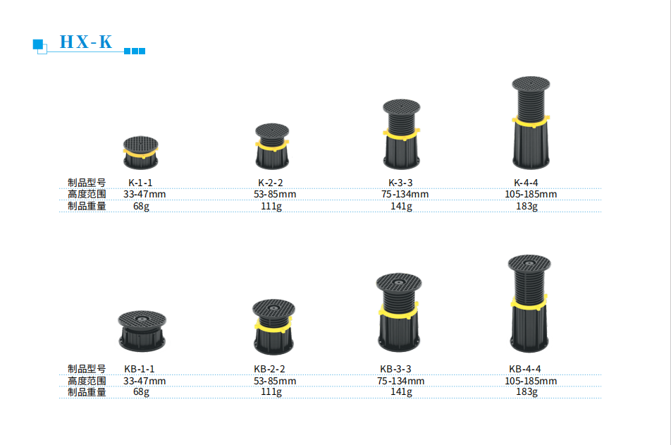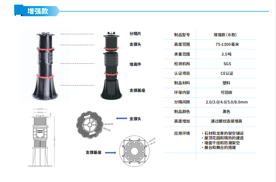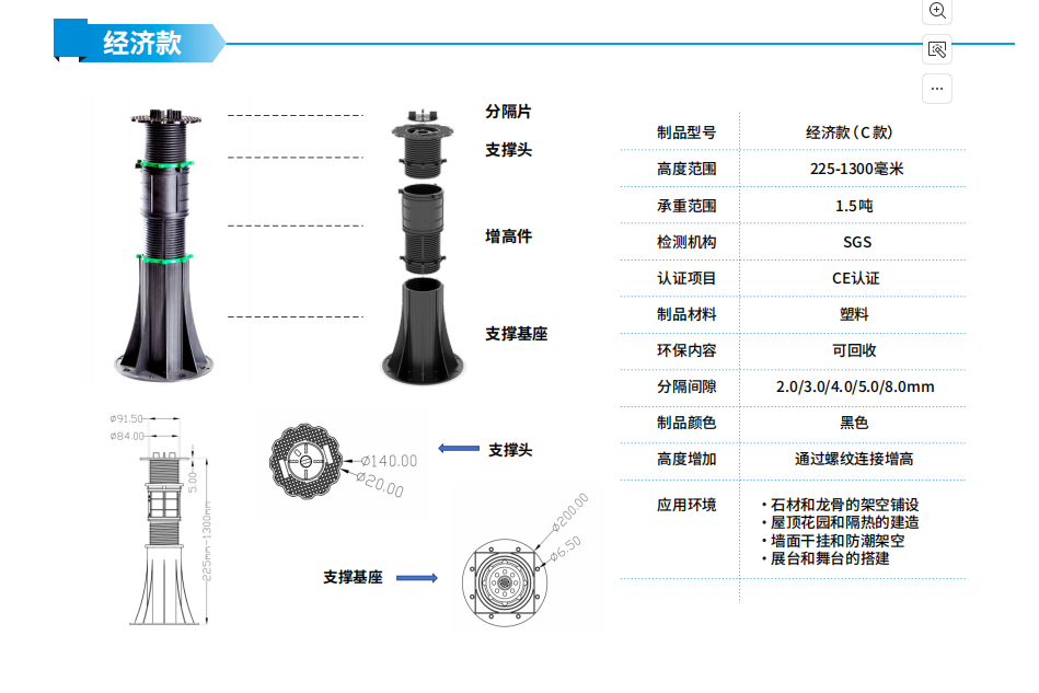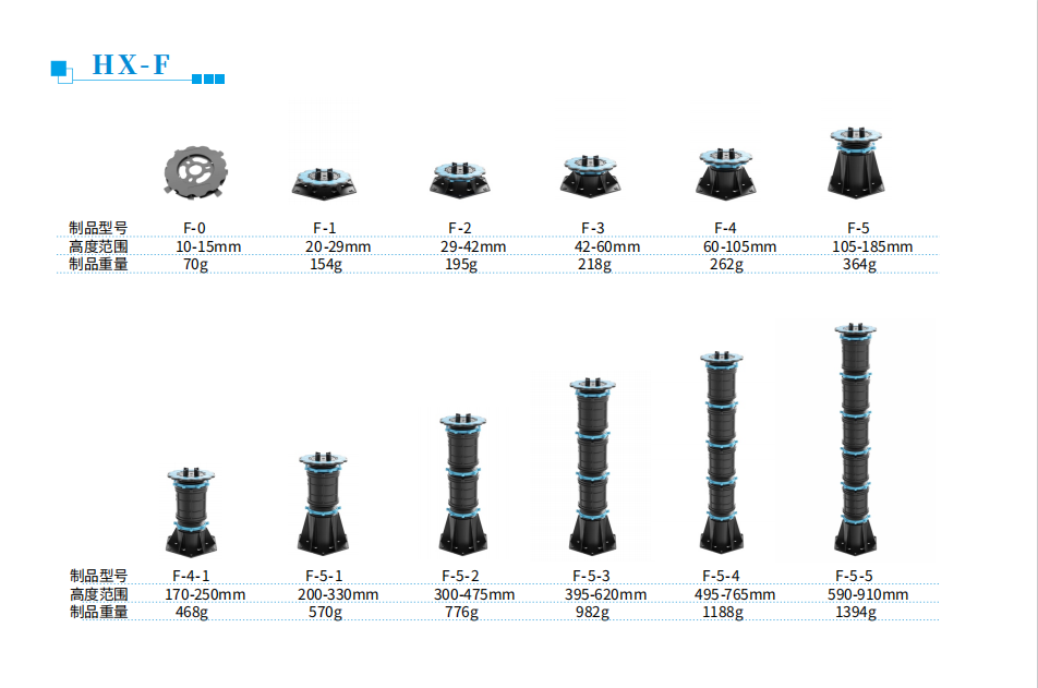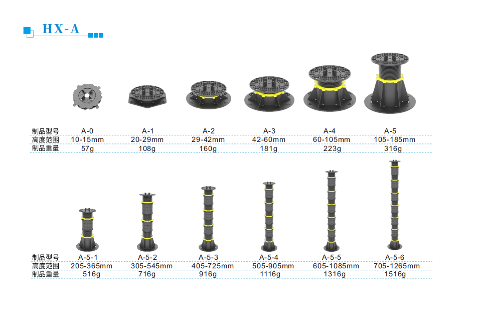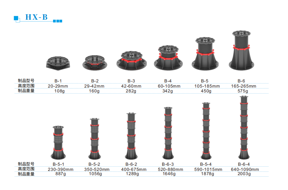從高度10mm迷你款,到1300mm多節(jié)增高款,涵蓋經(jīng)濟(jì)款、增強(qiáng)款、外銷款等系列,無(wú)論石材架空鋪裝、屋頂花園搭建,還是展會(huì)舞臺(tái)快速搭建,不同承重(1.5-3.5噸)、高度需求,都能精準(zhǔn)匹配,靈活應(yīng)對(duì)復(fù)雜項(xiàng)目場(chǎng)景。