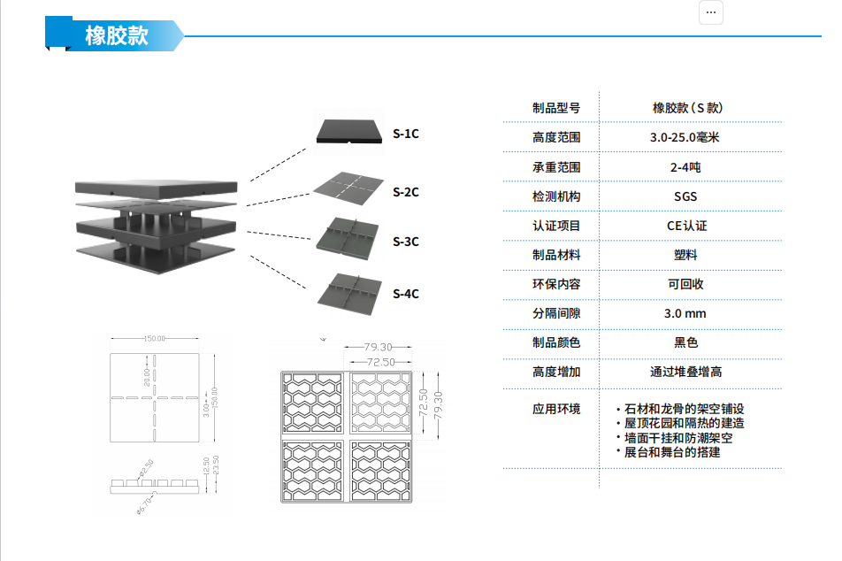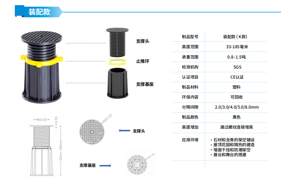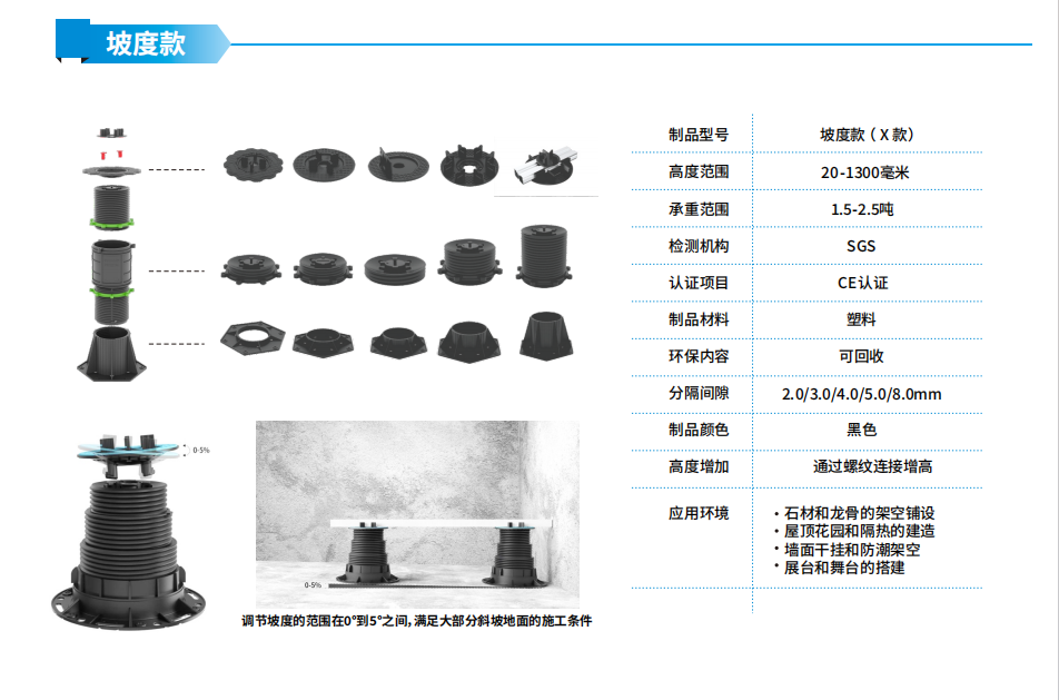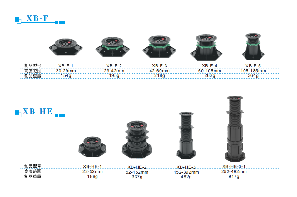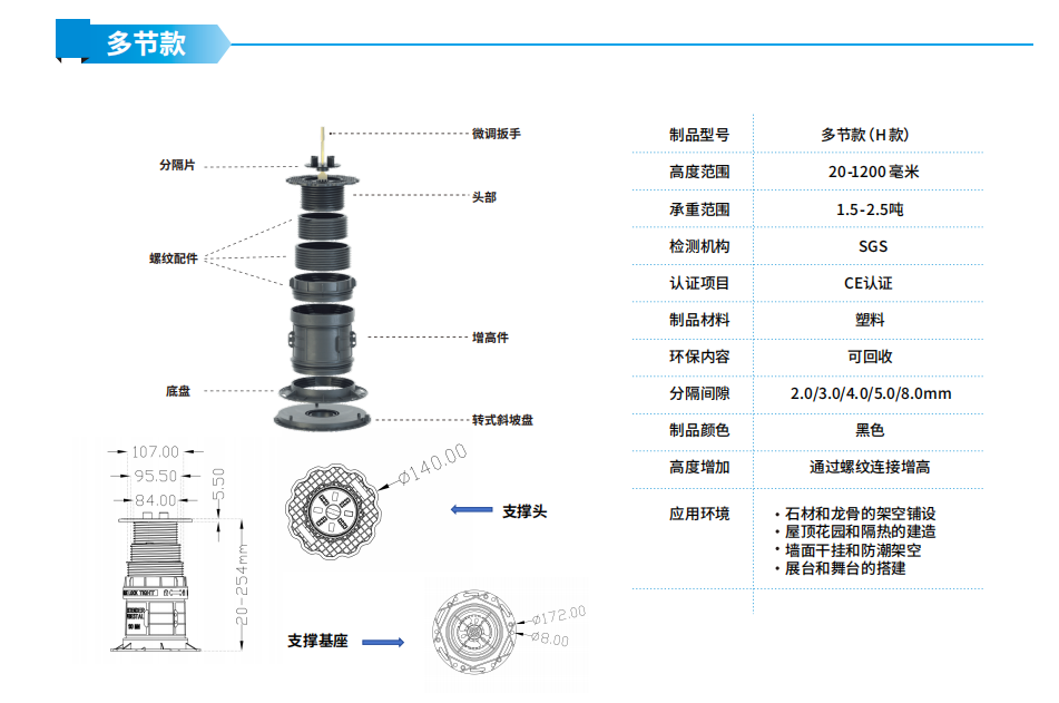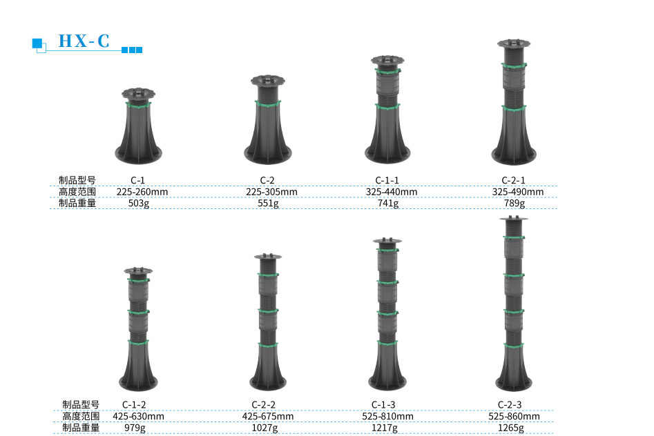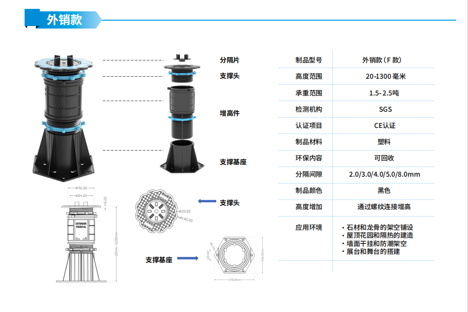 從高度10mm迷你款,到1300mm多節(jié)增高款,涵蓋經(jīng)濟(jì)款、增強(qiáng)款、外銷款等系列,無(wú)論石材架空鋪裝、屋頂花園搭建,還是展會(huì)舞臺(tái)快速搭建,不同承重(1.5-3.5噸)、高度需求,都能精準(zhǔn)匹配,靈活應(yīng)對(duì)復(fù)雜項(xiàng)目場(chǎng)景。